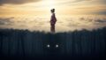 概念的なアート画像。分割画面。一方は、柔らかな太陽の下、穏やかな白い雲に浮かぶミニマルな日本の神社建築。もう一方は、鮮やかな青空の下、高い山頂にそびえる壮大な大理石のギリシャの宮殿。手前には、神話の本を持ち、思慮深い微笑みで空を見上げる30代後半の現代の日本人女性。リアルで幽玄な照明。 日本神話